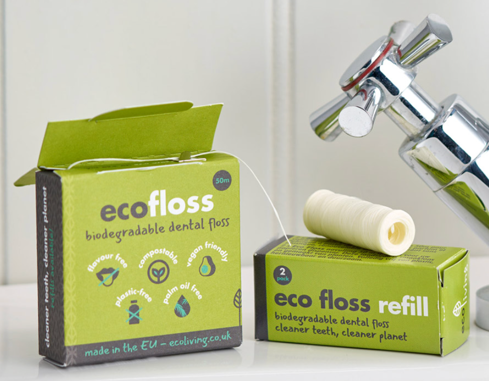 Eco Floss from ecoLiving.  Plant-based floss in a paper dispenser includes a generous 50m bobbin. The packaging becomes your dispenser.