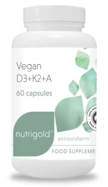 Nutrigold's Vegan Vitamin D3+K2+A formulation delivers a blend of synergistic fat-soluble vitamins (900μg Vitamin A; 100μg Vitamin K2 as menaquinone-7; 50μg (2000iu) Vitamin D3).